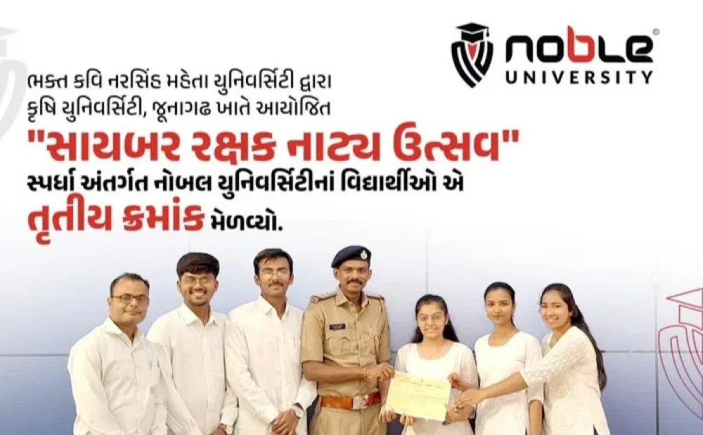 Students from Noble University showcased their talent and earned 3rd place at the "Cyber Rakshak Natya Utsav", organized by Bhakta Kavi Narsinh Mehta University at Agricultural University, Junagadh.