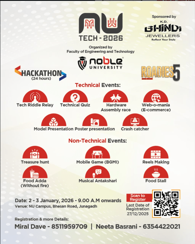 Sponsored by K.D. Bhindi Jewellers, NU Tech 2026 successfully fostered a culture of innovation, teamwork, and experiential learning, aligning with Noble University’s vision of nurturing industry-ready professionals. The event witnessed enthusiastic participation and emerged as a strategic platform for students to showcase talent beyond classrooms while strengthening peer collaboration and leadership capabilities.